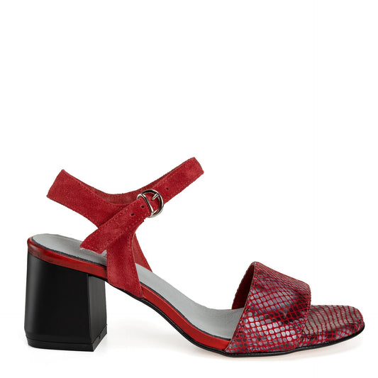 Елегантни дамски червени сандали от естественa кожа с принт и велур