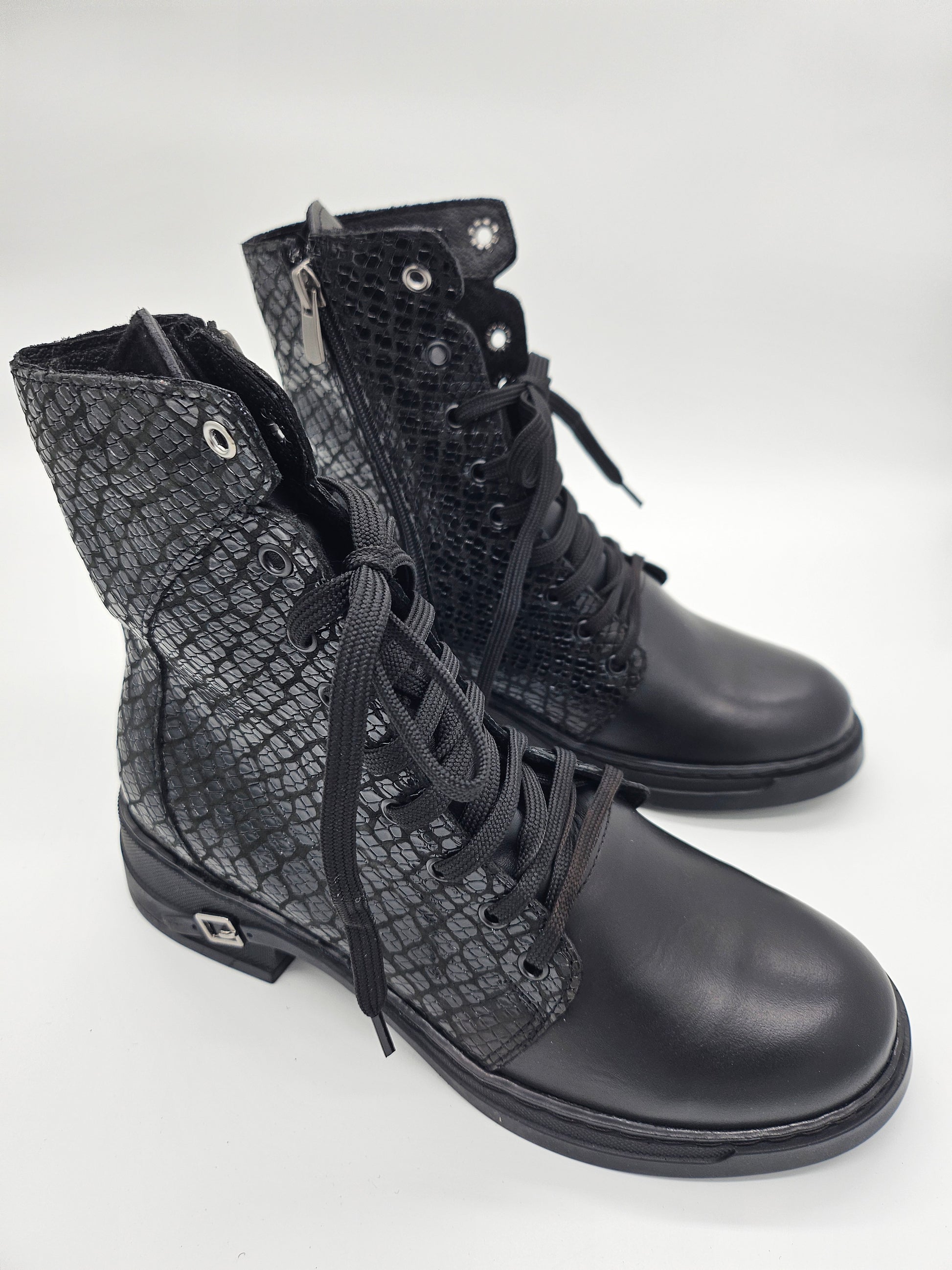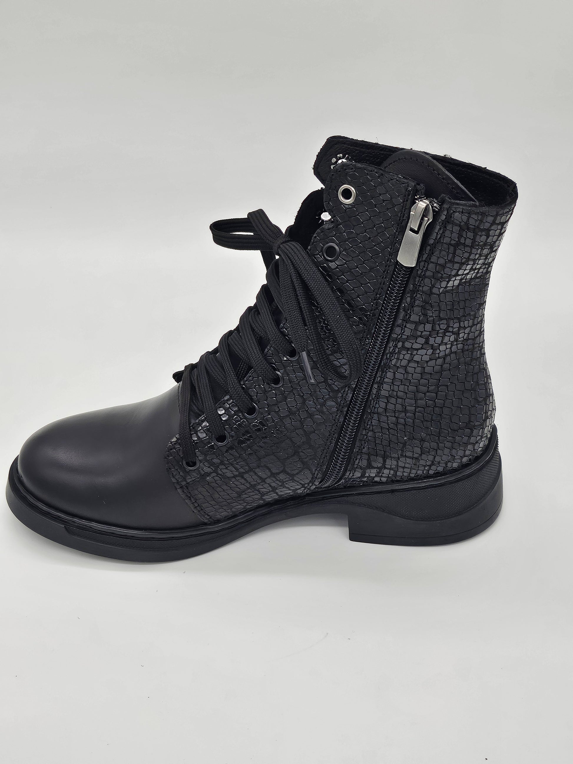 Изящната дантела в горната част придава уникален и женствен акцент, превръщайки традиционния модел в модно изявление. Практичността е на първо място – системата с връзки и цип гарантира лесно и бързо обуване, което спестява време и усилия.